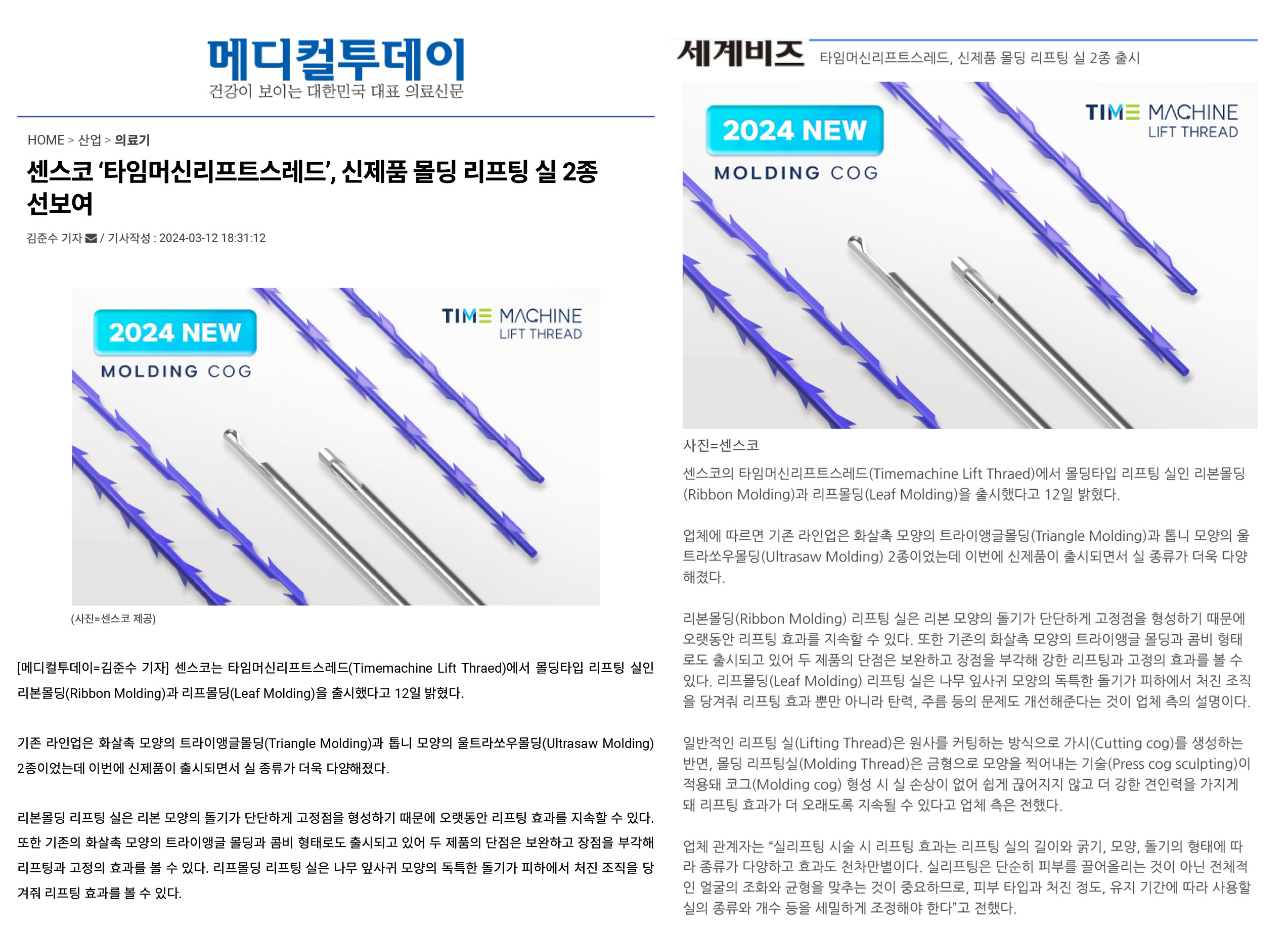 일반적인 리프팅 실(Lifting Thread)은 원사를 커팅하는 방식으로 가시(Cutting cog)를 생성하는 반면, 몰딩 리프팅실(Molding Thread)은 금형으로 모양을 찍어내는 기술(Press cog sculpting)이 적용돼 코그(Molding cog) 형성 시 실 손상이 없어 쉽게 끊어지지 않고 더 강한 견인력을 가지게 돼 리프팅 효과가 더 오래도록 지속될 수 있다.